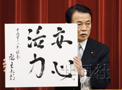 中新網1月5日電 據新加坡《聯合早報》報道,日本首相麻生太郎酷愛看漫畫,卻因為經常讀錯日文漢字,而被日本動畫大師宮崎駿譏笑。不過,麻生太郎為了證明自己對漢字的認識和對書法的掌握,元旦時揮毫寫下了“安心活力”四個字。