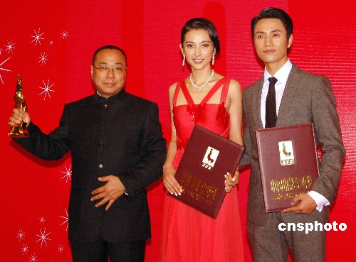 ,《云水瑤》以八項提名成為大熱門,最終繼獲“華表獎”之后再獲金雞獎最佳影片獎。圖為導演尹力與主演李冰冰、陳坤登臺領獎。