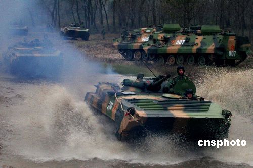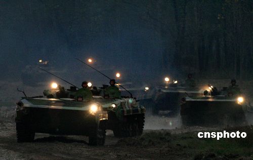 10月底,“鐵拳-2007”復(fù)雜電磁環(huán)境下機(jī)步師實(shí)兵檢驗(yàn)性演習(xí)完成電磁對抗,進(jìn)入實(shí)兵交戰(zhàn)階段。圖為裝甲部隊(duì)向演習(xí)地域集結(jié)。中新社發(fā) 曾憲平 攝