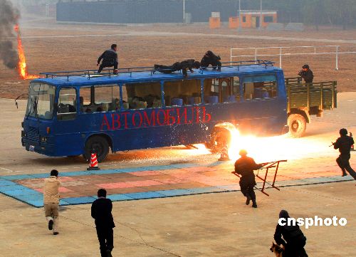 中國反恐特種部隊進行公共汽車反劫持演練。