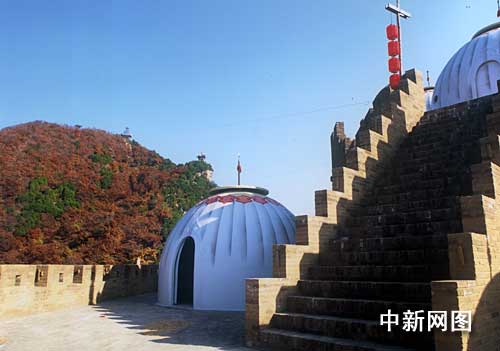 唐營:唐武德三年,秦王李世民在綿山雀鼠谷大戰(zhàn)劉武周時,曾在綿山安營扎寨。寨上帥旗高揚(yáng),二十八宿旗(東方七面青旗、北方七面皂旗、西方七面白旗、南方七面紅旗),迎風(fēng)獵獵。四周有諸多兵士各持旌旗,寶蓋、大戟、長戈、黃鉞、白旄、朱幡、皂、纛,十分威武雄壯。唐營依嶺而上,設(shè)有三道關(guān)隘,第一道為硬弓強(qiáng)弩,第二道為擂木砲石,第三道為長槍大刀,葛藤盾牌。此處設(shè)有中軍帳,為李世民議事處。陳列有虎威椅、虎符、令牌、令旗;李世民佩帶的寶劍、使用的青龍大刀;軍事地圖等。四周設(shè)有前、后、左、右軍帳,陳列有文武大臣裴寂、程咬金的兵器、兵書及軍用品等。唐營一排排兵器架上,刀槍劍戟、斧、鉞、鉤、叉锃光瓦亮,一個個守營軍士全身披掛,威風(fēng)凜凜。