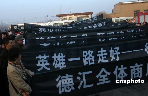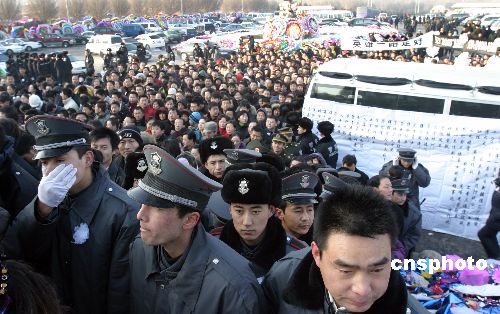 1月7日上午,烏魯木齊市燕兒窩殯儀館,萬余名烏魯木齊市民悼念在“1.2”火災(zāi)中犧牲的消防戰(zhàn)士朱曉雷、張宇、高峰3位烈士。朱曉雷、張宇、高峰的英雄事跡在社會(huì)上引起強(qiáng)烈反響,新疆各族群眾自發(fā)前往吊唁。自治區(qū)人民政府追授三位烈士為“模范消防衛(wèi)士”,公安部批準(zhǔn)他們?yōu)楦锩沂浚灾螀^(qū)團(tuán)委追授三位烈士“新疆青年五四獎(jiǎng)?wù)隆保灾螀^(qū)公安廳授予三位烈士“優(yōu)秀共產(chǎn)黨員”榮譽(yù)稱號(hào)。中新社發(fā) 李雄心 攝