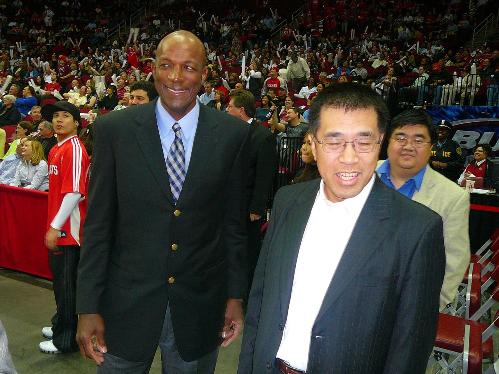 火箭隊(duì)“滑翔機(jī)”得雷克斯勒(右)見到老朋友王寧后特別高興。美國《明橋體育》供圖 / 許陽 言心 攝影