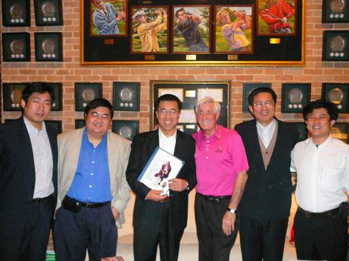 王寧部長(左3)在《明橋體育》負(fù)責(zé)人和當(dāng)?shù)刂A人企業(yè)家郭翔的陪同下,拜訪六十年代國際著名的高爾夫球星道格-桑德斯(右3),并邀請他到中國去訪問。美國《明橋體育》供圖 / 許陽 言心 攝影