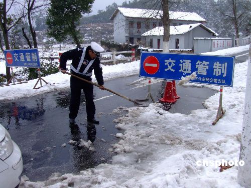 1月中旬以來(lái),江西宜春遭遇幾十年一遇的冰雪災(zāi)害天氣。2月3日上午,江西宜溫公路被迫關(guān)閉,宜春交警冒著嚴(yán)寒疏導(dǎo)交通,11點(diǎn)30分實(shí)現(xiàn)單線行車(chē)。中新社發(fā) 彭小榕 攝