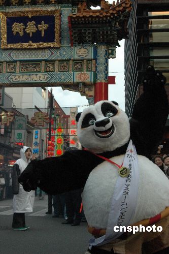 圖為游行隊列中的超級大熊貓在中華街匾額下向游客揮手致意。