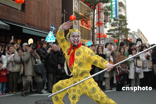 圖為游行隊列中深受日本民眾喜愛的孫悟空以其高超的功夫博得一片喝彩。