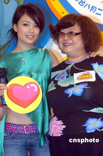 歌星容祖兒2005年7月21日在香港出席無線電視《兒歌金曲頒獎典禮2005》記者會,并與擔任頒獎典禮大會司儀的沈殿霞會上合影。中新社發 鄧慶樂 攝