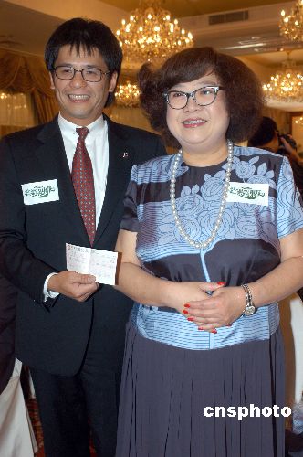 2005年,“肥姐”沈殿霞代表朋友將一張二十萬元支票向東華三院捐贈,東華三院主席王定一親手接收。中新社發 鄧慶樂 攝