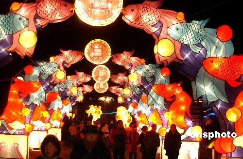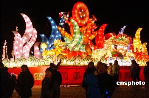 2008沈陽迎春燈會在沈陽世博園舉行,本屆燈會展出北京奧運、鼠年吉祥、世界遺產、京劇臉譜、童話王國、沈陽地標、傳統花燈、書法藝術八大主題系列,展線長3400米,花燈數量超過3000盞,花燈品類達到80多個,其中以“北京奧運”為主題的組燈受到市民的“追捧”。中新社發 羅瀾 攝