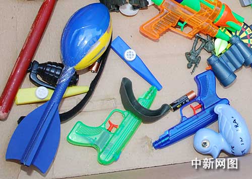 紙盒內的“導彈”、“槍械”----它們都是兒童塑料玩具。