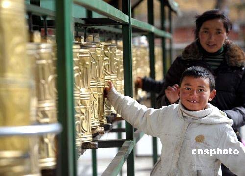 3月20日,一名可愛的拉薩兒童在布達拉宮北側轉經。