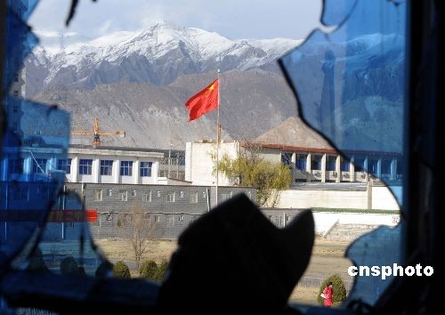 3月21日,拉薩二中的中學(xué)生在被焚毀的教室前集會(huì)控訴不法分子罪行。