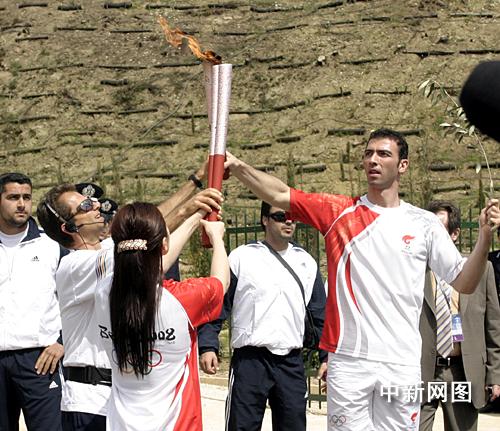 希臘當(dāng)?shù)貢r(shí)間3月24日,北京二00八年奧運(yùn)會(huì)圣火采集儀式在古奧林匹亞競(jìng)技場(chǎng)舉行,隨后火炬希臘傳遞開(kāi)始。第一棒希臘運(yùn)動(dòng)員亞歷山大和第二棒中國(guó)的雅典奧運(yùn)會(huì)冠軍羅雪娟對(duì)接火炬。 中新社記者 王歡