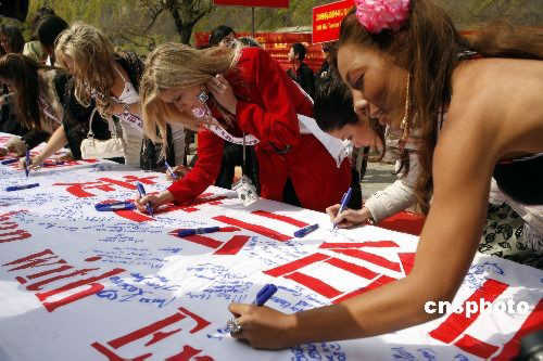 三月二十七日,來自世界一百一十五個國家和地區(qū)的的國際旅游小姐在河南云臺山簽名,祝福北京奧運成功舉辦。當(dāng)日,來河南參加國際旅游小姐總決賽的各國佳麗巡游來到河南焦作云臺山世界地質(zhì)公園。中新社發(fā) 慎重 攝