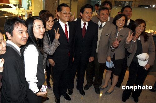 臺灣地區領導人當選人馬英九上午拜會中國國民黨榮譽主席連戰。會后和工作人員與市民一起合影。中新社發 杜洋 攝