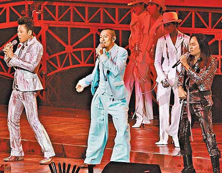 草蜢三位成員(左起)蔡一杰、蘇志威及蔡一智載歌載舞演繹張國榮歌曲。