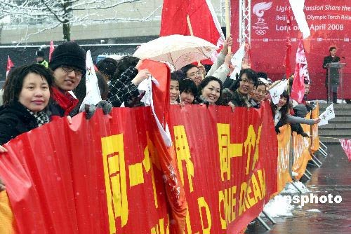 圖為中國留學生在溫布利體育場外為奧運圣火助威。 沈晨 攝