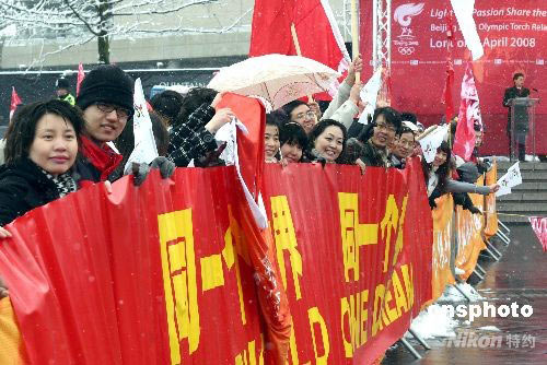 倫敦是北京奧運(yùn)圣火境外傳遞過程中,傳遞路線最長、最復(fù)雜的城市。約八個(gè)半小時(shí)的圣火傳遞,包括了輪船、自行車、敞篷公共汽車、輕軌等四種特殊傳遞方式。圖為中國留學(xué)生在溫布利體育場外為奧運(yùn)圣火助威。 沈晨 攝