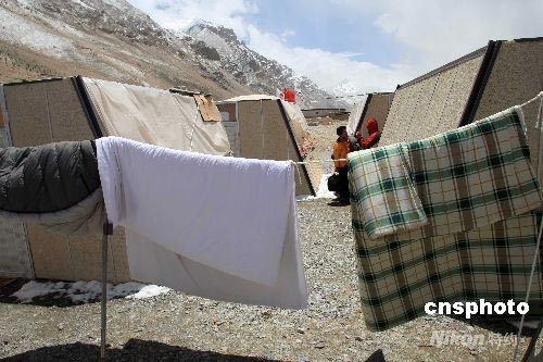 5月4日,在連續降雪后,住在珠峰大本營絨布新聞中心簡易屋的中外記者,抓住短暫晴天晾曬睡袋和被子。中新社發 盛佳鵬 攝