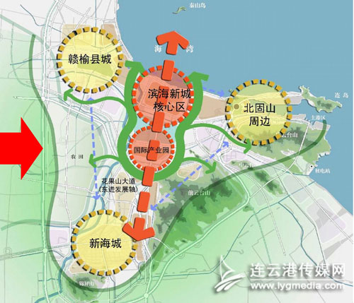 一心三極的內(nèi)涵是,以連云港新海城區(qū)、東部城區(qū)、贛榆城區(qū)形成相互聯(lián)動(dòng)的三大增長極,而位于三極之間的海濱新區(qū)是未來最為重要的城市核心。