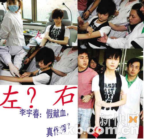 但是李宇春此次義舉卻被網(wǎng)友質(zhì)疑是一場做秀,有網(wǎng)友在論壇貼出圖片,“揭發(fā)”李宇春獻(xiàn)血的手忽左忽右。昨日記者致電天娛負(fù)責(zé)藝人管理的胡小姐,對方對做秀傳言表現(xiàn)得很氣憤,說:“現(xiàn)在這個時候,如果這種事都還造假,那就根本不配做藝人,甚至不配做人。”