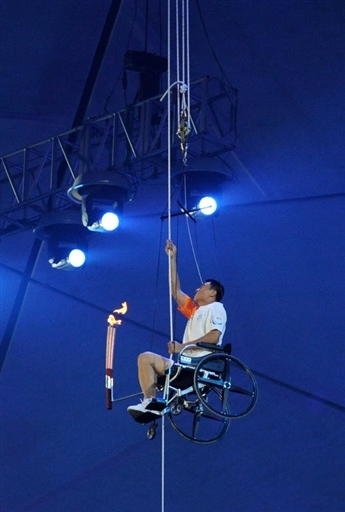 而點燃主火炬的侯斌與李寧相比則更顯得堅毅向上。這位三屆殘奧會跳高金牌得主坐在輪椅上,一點一點的用手拉著繩索向上攀爬,并最終用火炬點燃了主火炬。他艱辛的上升過程,也牽動了所有觀看點火儀式的觀眾的心。不過,他用成功證明了自己,點燃了北京殘奧會的熊熊圣火。