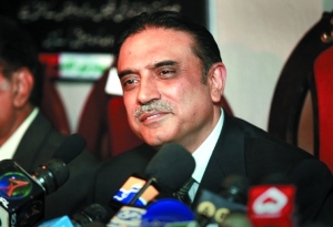 扎爾達里生于1956年,是已故總理貝·布托的丈夫。圖為2008年2月21日,扎爾達里在伊斯蘭堡出席新聞發布會。