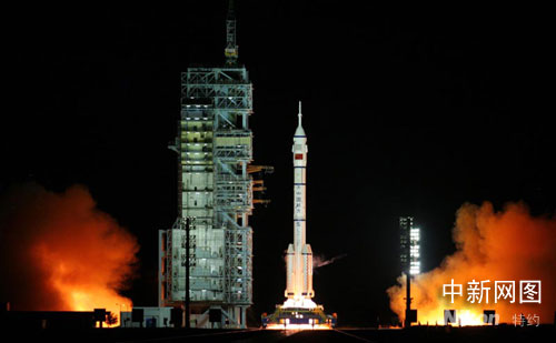 9月25日21時10分,長征二號F型運載火箭點火,神舟七號飛船在酒泉衛星發射中心升空。孫自法 攝