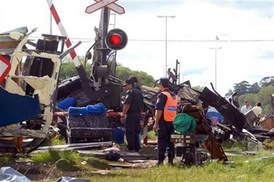目擊者說(shuō),那輛巴士在凌晨?jī)牲c(diǎn)多行經(jīng)平交道的時(shí)候,不顧警告訊號(hào)和已經(jīng)放下的柵欄企圖硬闖,結(jié)果被火車撞成兩截,殘骸躺在鐵軌邊,行李箱、衣服和脫落扭曲的巴士座椅散落在鐵軌邊,火車也部份出軌。
