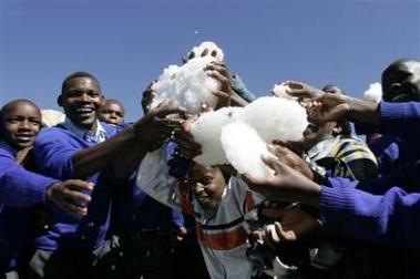 據(jù)《星島日報(bào)》消息,在肯尼亞首都內(nèi)羅畢西北200多公里外的一個(gè)鄉(xiāng)村,居民3日早上起床時(shí),發(fā)現(xiàn)草地一夜間鋪上了一層冰雪,很多村民一生都未見過下雪,有人拾起冰塊消暑,亦有人乘機(jī)打雪戰(zhàn)。