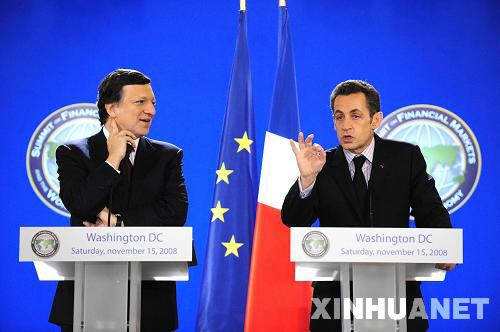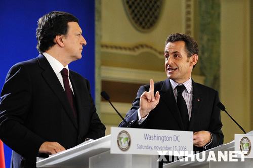 11月15日,在美國首都華盛頓出席二十國集團領導人金融市場和世界經濟峰會的法國總統薩科齊(右)和歐盟委員會主席巴羅佐聯合舉行新聞發布會。 新華社記者張巖攝