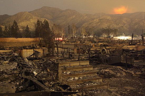 大火是上周四晚上在人口密集的圣費(fèi)爾南多山谷燃起的,摧毀了數(shù)十間房屋,并對(duì)關(guān)鍵的電力供應(yīng)線路構(gòu)成了威脅。大火在風(fēng)力的幫助下燒過干燥的山谷和山坡,熱風(fēng)使當(dāng)?shù)販囟冗_(dá)到創(chuàng)記錄的30度。火勢在時(shí)速達(dá)112公里的強(qiáng)風(fēng)的幫助下蔓延了2600英畝,迫使1萬名居民撤離,自上周四以來,過火面積已超過20000英畝,發(fā)生火情的地區(qū)包括洛杉磯北部的山丘、東南部的奧蘭治縣山谷、北部圣巴巴拉縣附近名人聚集的蒙特其托居住區(qū)。估計(jì)有1000套房屋被燒毀。加州州長施瓦辛格在視察火災(zāi)造成的損失情況后稱:“對(duì)于南加州人來說,過去的幾天非常艱難。”