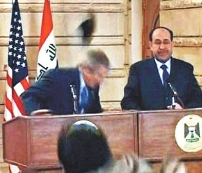 于伊拉克開記者會期間,遭伊拉克記者扎赫迪的“鞋彈”襲擊,難得的是他閃躲得快,有人更戲稱他的身手好比電影《22世紀殺人網絡》中的基諾里維斯。