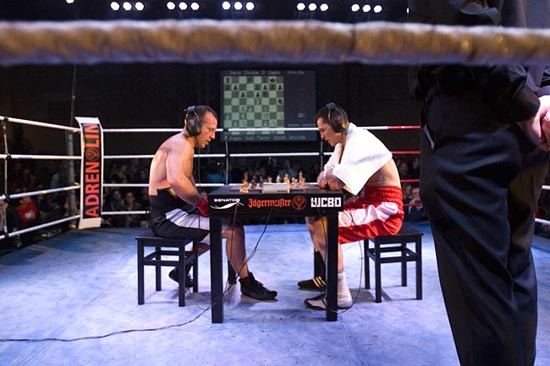 這個(gè)比賽結(jié)合了腦袋和拳頭的較量。比賽規(guī)則很簡單,先進(jìn)行4分鐘的國際象棋比賽,然后再進(jìn)行3分鐘的拳擊比賽,象棋和拳擊交替進(jìn)行,11個(gè)回合之后比賽結(jié)束。參賽者是否取勝要看是否能在擂臺(tái)上擊倒對手并在棋盤上將死對手。主辦者希望通過這個(gè)比賽證明,戰(zhàn)士可以成為智者,智者也可以是戰(zhàn)士。