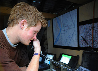 23歲的哈里王子在駐阿英軍第52旅下屬的皇室騎兵團作戰組服役,他在赫爾曼德省邊遠地區的任務是協調各種飛機的作戰行動,其中包括美國的F-15戰斗機、英國的“鷂”式攻擊機、阿帕奇武裝直升機、 C-130H“大力士”運輸機。他因此要和英國皇家空軍“鷂”式攻擊機女飛行員米歇爾-湯普金斯和她的同事們保持經常性的接觸,飛行員只有在獲得他的批準后才能對目標發動攻擊。