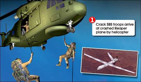 據報道,這架“死神”無人駕駛偵察機在此前執行一項特別任務時墜落。英國皇家特種舟艇部隊(SBS)派出人員,乘直升機降落在偵察機墜落地點附近,將包括相機和電腦存儲器在內的一些高機密儀器取走。