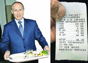參觀結束后普京決定到汽車公司職工食堂吃午飯。雖然身為總理,普京卻自己拿著塑料托盤,和普通工人一樣排隊買飯。在柜臺前,他給自己點了一份面條湯、一份牛肉片、一份蔬菜色拉、一份米飯、一塊餡餅和一杯茶,一起只要57盧布,約合人民幣16塊8角。