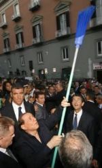 他其后親自走到街上視察,大批記者跟隨采訪和拍照。突然間,貝盧斯科尼叫助手拿來一把掃帚,由他親自掃街。他又在街旁拾起一只=丟棄的塑料杯,把它放進垃圾桶筒內。