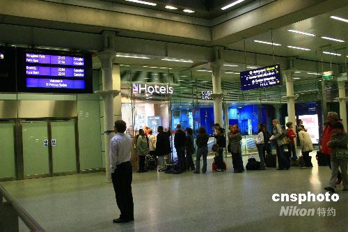 圖為11日晚間,倫敦圣潘克斯火車站取消了前往巴黎和布魯塞爾的列車,現場滯留的乘客被迫排隊等候訂酒店。