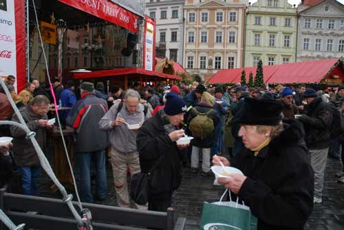 布拉格市政廳一如既往12月24日中午在市中心老城廣場向無家可歸的人免費發放魚湯。