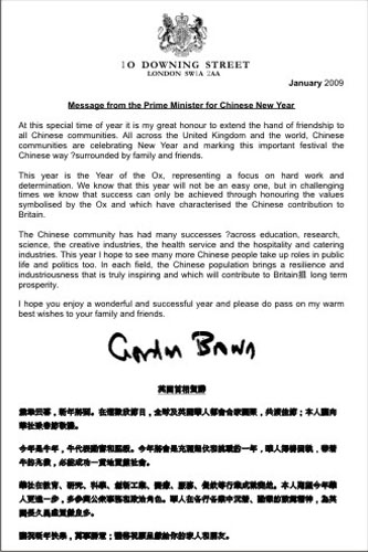 中新網(wǎng)1月24日電 據(jù)“中央社”報(bào)道,23日,英國(guó)首相布朗向華人拜年,誠(chéng)摰祝福大家新的一年心想事成,順利成功,并希望新的一年有更多華人參政。