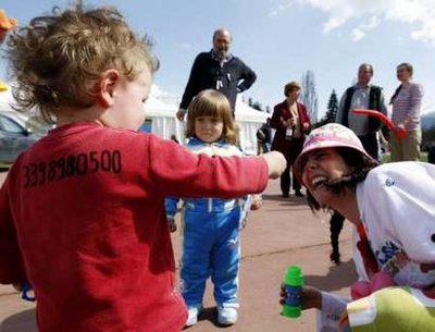 在另一處避難營地,一些紅鼻子的小丑跳起滑稽舞蹈,還有一些小丑吹起肥皂泡,向孩子們分發氣球,和他們一起玩游戲。