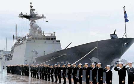 中新網3月4日電 據韓國《中央日報》報道,3日,將被派遣到索馬里海域的韓國海軍“清海部隊”成立儀式在海軍作戰司令部釜山基地舉行。清海部隊擁有一艘4500噸級驅逐艦“文武大王艦”、一架反潛直升機和30名履行訊問搜索任務的特戰人員等,加上文武大王艦上原有的船員,總規模達到了300多人。
