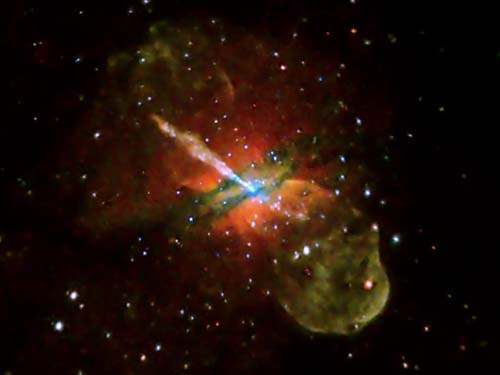 圖片中的左上角是一條延伸距離達(dá)1.3萬(wàn)光年的X射線噴射物,以及一條向反方向延伸的較短的“反向噴射”。天文學(xué)家認(rèn)為,這種動(dòng)力射流起到了重要的運(yùn)輸作用,把來自黑洞的能量傳遞到規(guī)模更大的星系,同時(shí)還影響那里恒星的速度。
