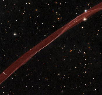 科學(xué)家表示,這個殘余其實(shí)是來自恒星爆炸的部分沖擊波。而且,暴動的殘余還在爆炸之中,每小時大約移動1千萬公里。哈伯圖像主要是由殘余的氫原子發(fā)射出的可見光、藍(lán)光、黃綠光和近紅外線光共同生成的合成圖像。這個扭曲光帶的明亮部分是來自爆炸的沖擊波位于我們視線的邊緣。