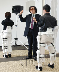 筑波大學(xué)教授山海嘉之(中)正在講解“機(jī)器人Suit HAL”如何幫助老年人及殘疾人。