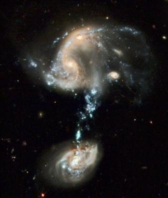 被稱作Arp 194的星系群,圖片中出現(xiàn)的明亮的藍色彩帶,其實是新生藍色恒星向外延伸的完整的螺旋臂。當兩個星系利用引力相互作用時,就會出現(xiàn)這種現(xiàn)象。