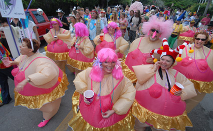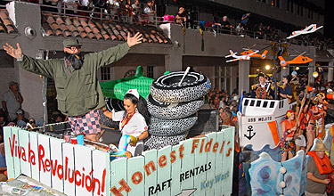 歷時10天的活動里,彩車上的人們有的身著盛裝,有的扮成動物,甚至有幾名女子打扮成前白宮實習生萊溫斯基的樣子,也有狂歡者站在花車上撒錢。