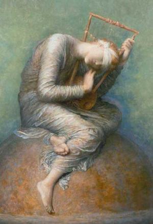 畫面上一個年輕女子坐在象征世界的地球上面,身體向前傾斜,低垂著頭,眼睛被蒙上繃帶,手里彈撥著僅剩下一根弦的古希臘七弦琴,并俯身傾聽這根弦發出的微弱樂音。畫家的意圖是表現人類直到最后也不能喪失希望,不過觀眾的感受可能會有所不同,覺得只剩下生命的最后一根弦,正面臨著危機。